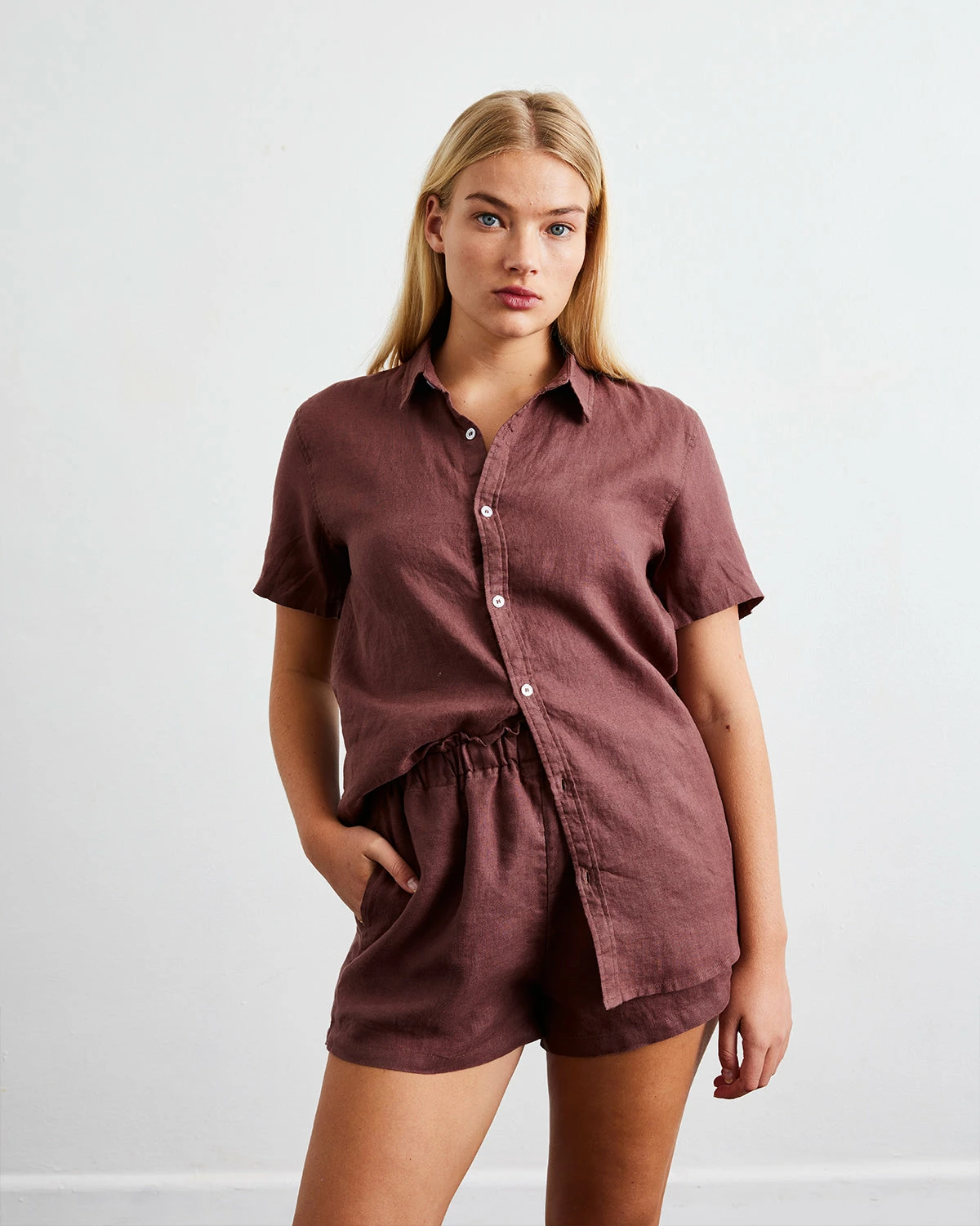 Our 100% French flax linen CacaoShort Sleepwear Set will be your new wear-on-repeat wardrobe staple. This all-in-one set features a relaxed fit to keep you feeling cool under the covers, and looking cool out of them. With a moisture-wicking fabrication and coordinated color, our Short Sleepwear Set comes complete with a button-down Short Sleeve Shirt and matching pair of Shorts finished with an elasticated waist.