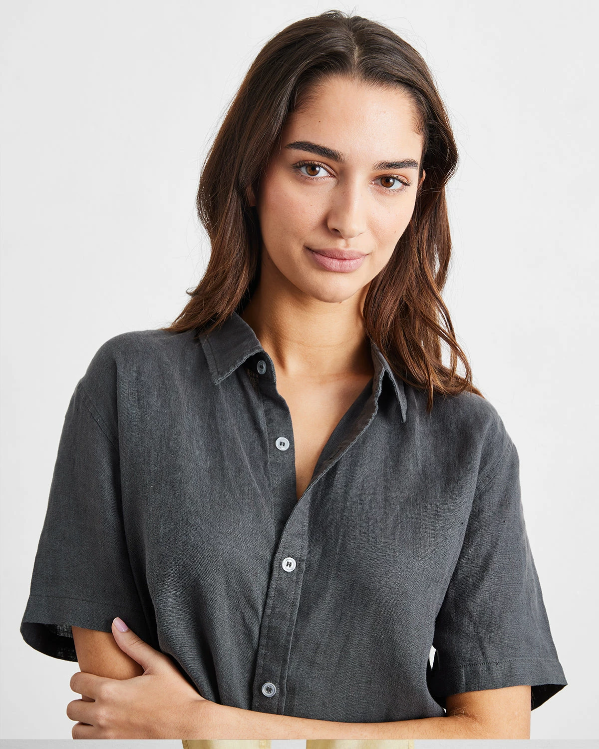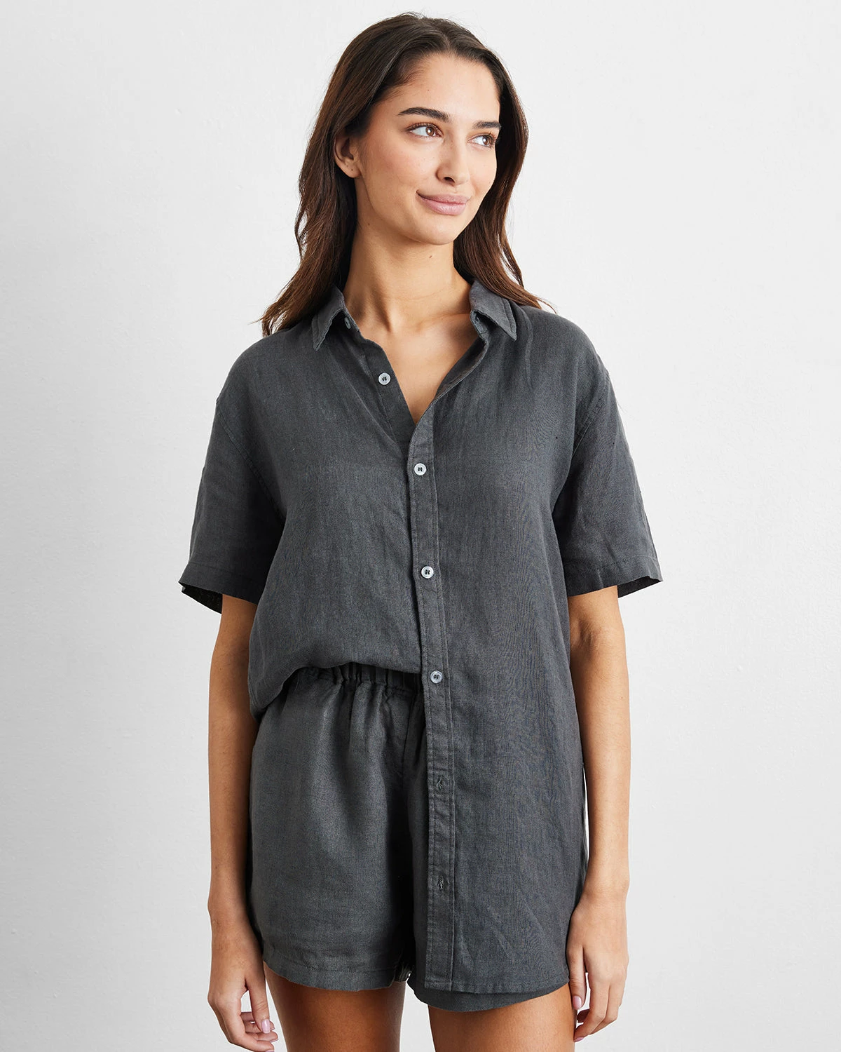 Meet your new loungewear must-have. Our 100% French Flax Linen Short Sleeve Shirt is just about the most comfortable way to spend your nights (and days). Featuring a relaxed fit and extended length that looks stylish tucked in or out, this effortlessly chic shirt will keep you cool under the covers thanks to its moisture-wicking fabrication and wide-fitting sleeves. Pair with our Linen Shorts for the ultimate summer set, or team this versatile essential with your favourite wardrobe staples.