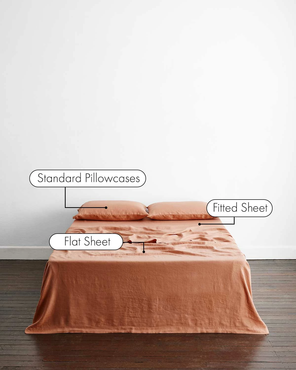 Buttery soft, pre-washed and designed to last, our 100% French flax linen sheet set inHazelnut includes two pillowcases, a flat sheet and a fitted sheet. Perfect for those who prefer to sleep without a duvet cover, or simply love a layered linen-clad bed.