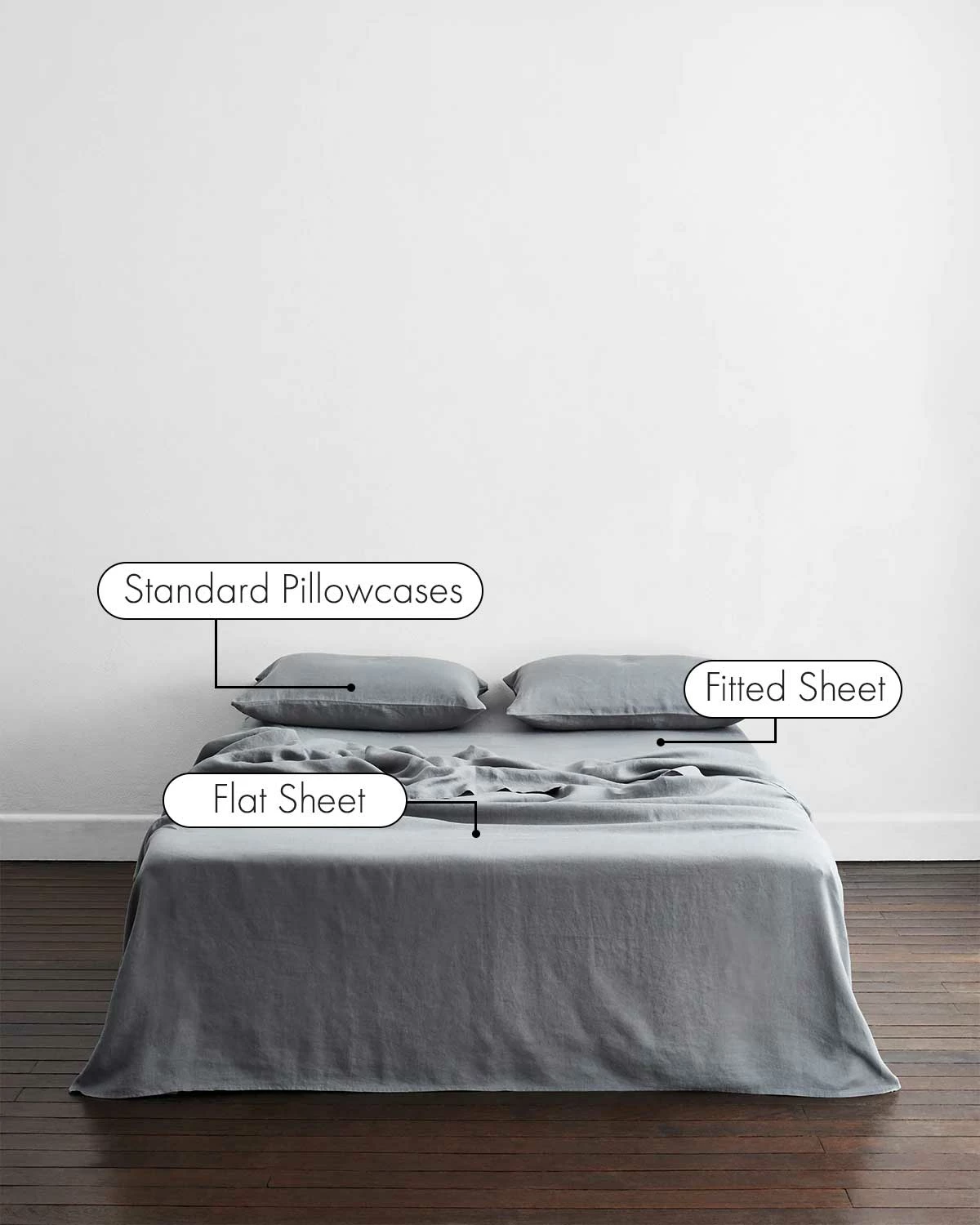 Buttery soft, pre-washed and designed to last, our 100% French flax linen sheet set in Mineral includes two pillowcases, a flat sheet and a fitted sheet. Perfect for those who prefer to sleep without a duvet cover, or simply love a layered linen-clad bed.