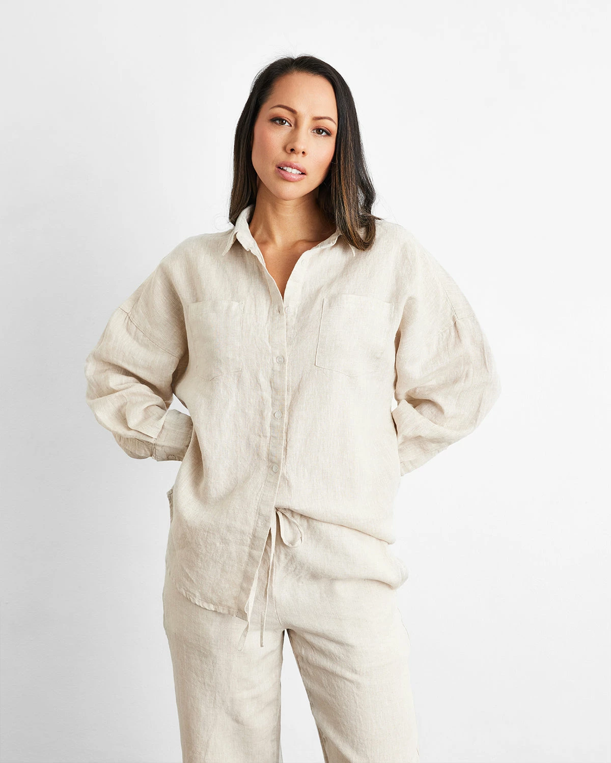 A set for all seasons, our 100% French flax linen Oatmeal Long Sleepwear Set makes for the perfect outfit in and out of the bedroom. This effortlessly chic set is simple yet refined, combining a loose-fitting Long Sleeve Shirt with a pair of full-length Pants finished with a drawstring waistband. Perfect for evenings on the couch, a great night’s sleep, or even a stroll to the coffee shop.