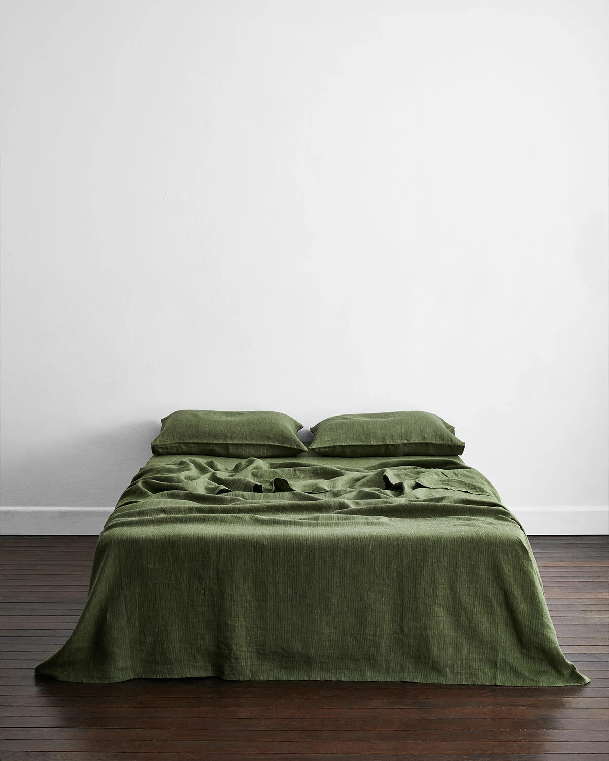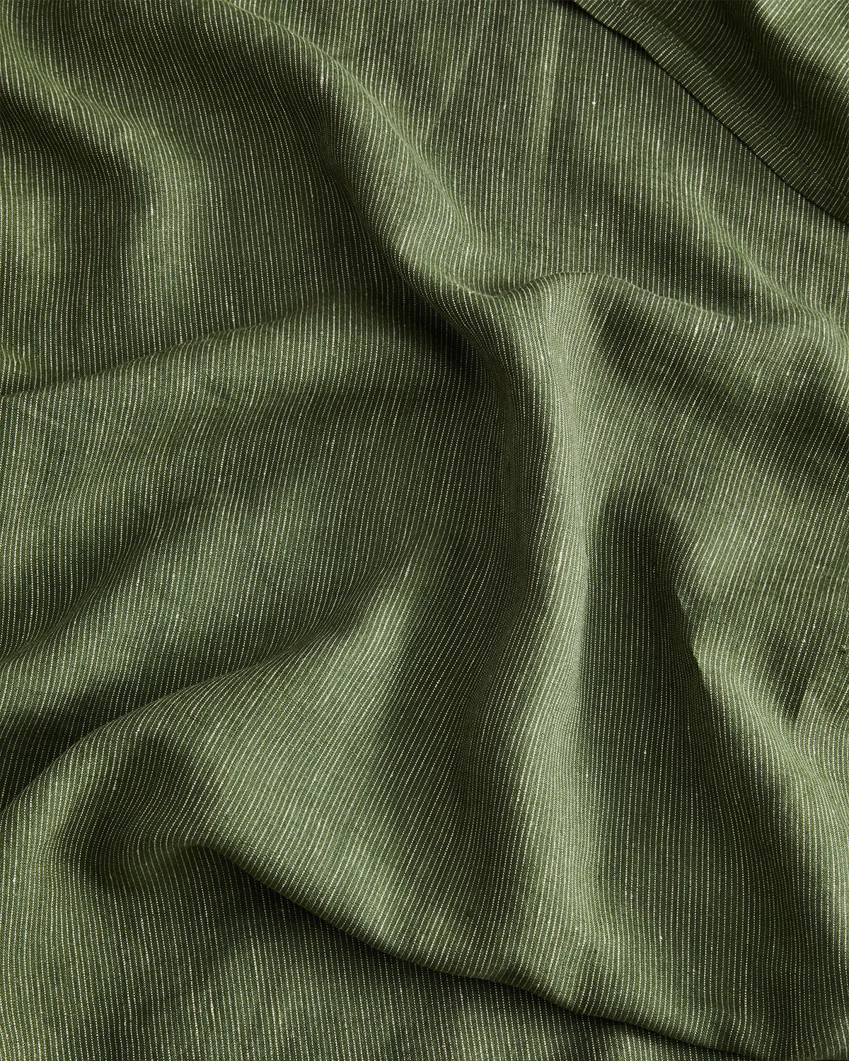 Ultra soft and incredibly durable, our 100% French flax linen flat sheet in Olive Stripe is a versatile addition to your collection. Generously sized to just graze the floor, these sheets serve as lightweight covers on their own, or as a luxurious extra layer alongside other linen pieces.
