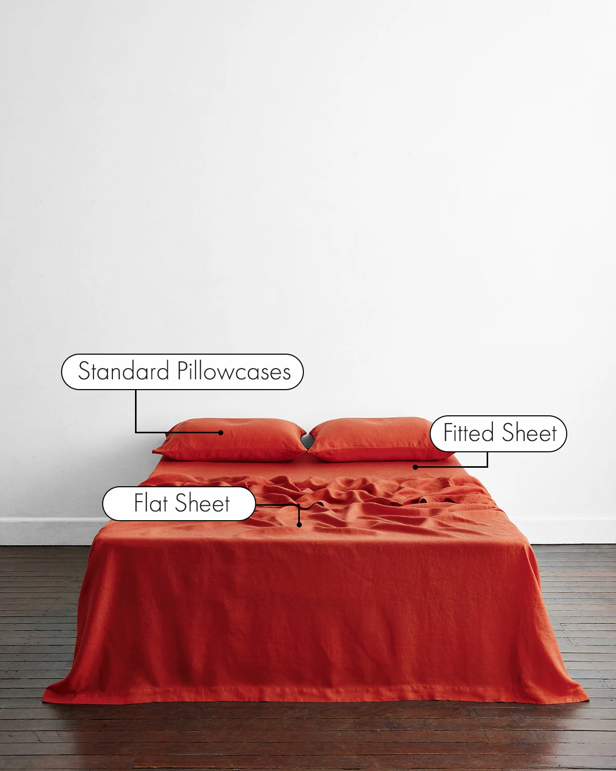 Buttery soft, pre-washed and designed to last, our 100% French flax linen sheet set inPaprika includes two pillowcases, a flat sheet and a fitted sheet. Perfect for those who prefer to sleep without a duvet cover, or simply love a layered linen-clad bed.