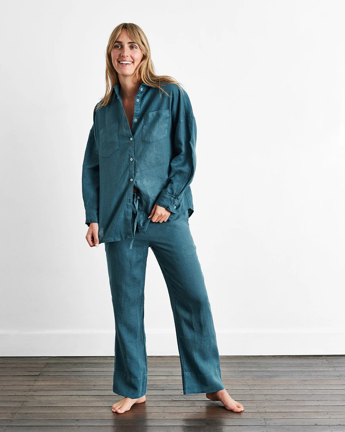 A set for all seasons, our 100% French flax linen Petrol Long Sleepwear Set makes for the perfect outfit in and out of the bedroom. This effortlessly chic set is simple yet refined, combining a loose-fitting Long Sleeve Shirt with a pair of full-length Pants finished with a drawstring waistband. Perfect for evenings on the couch, a great night’s sleep, or even a stroll to the coffee shop.