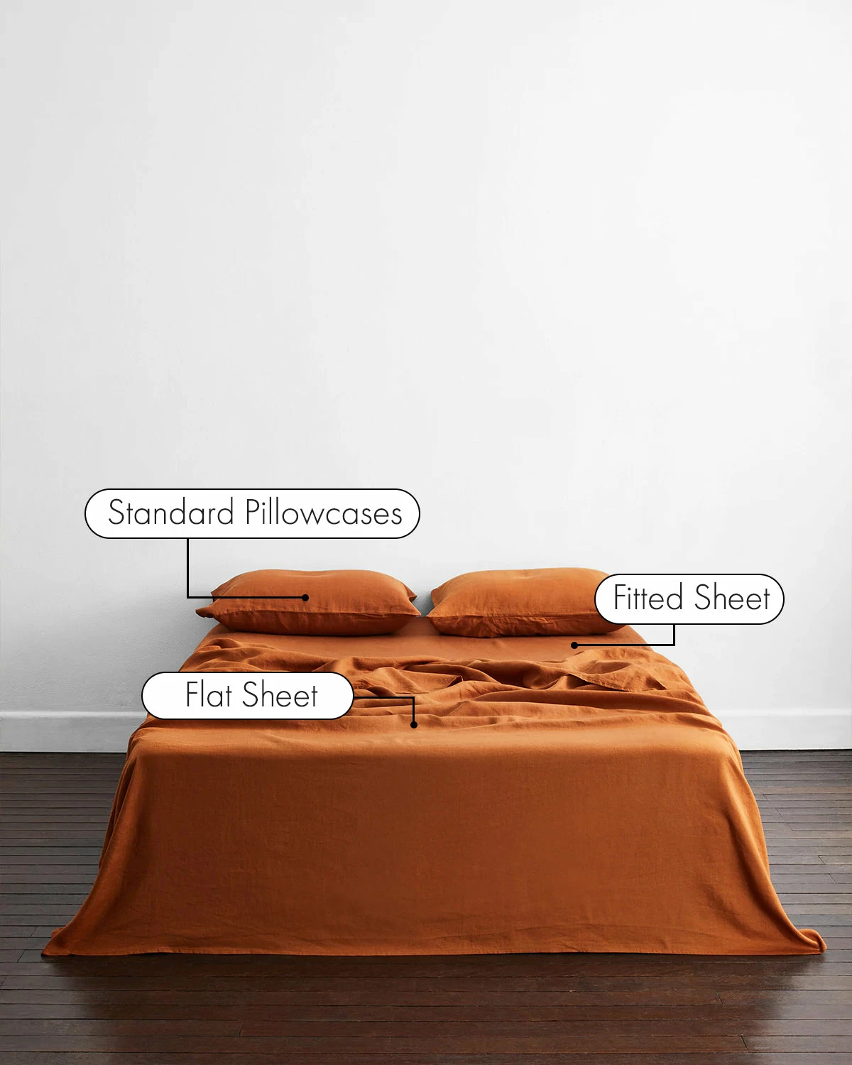 Buttery soft, pre-washed and designed to last, our 100% French flax linen sheet set in Rust includes two pillowcases, a flat sheet and a fitted sheet. Perfect for those who prefer to sleep without a duvet cover, or simply love a layered linen-clad bed.