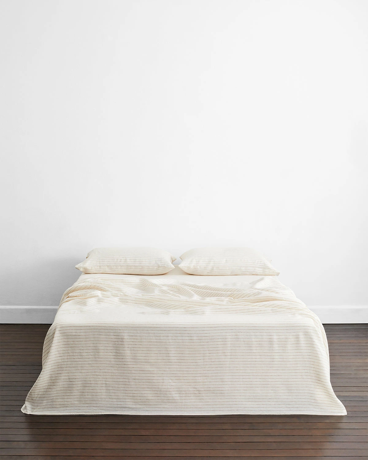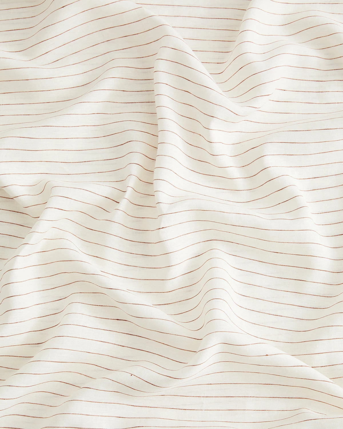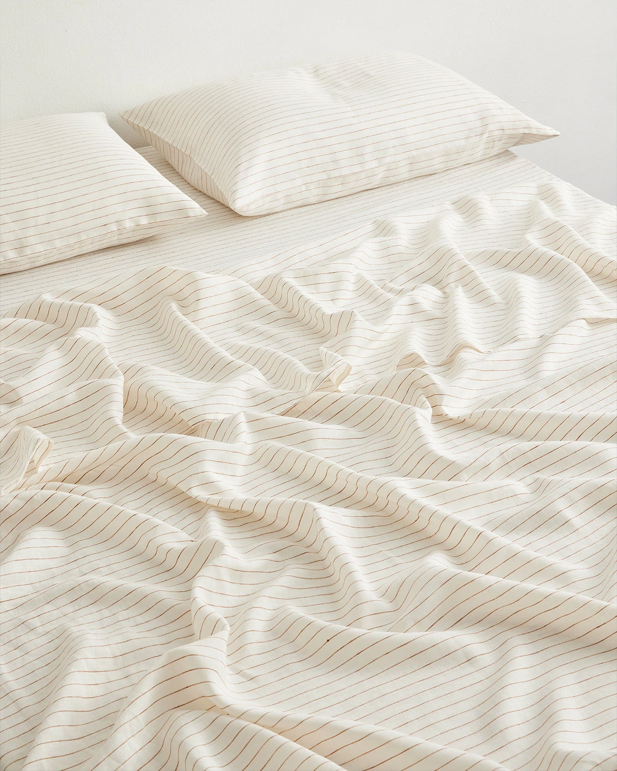 Ultra soft and incredibly durable, our 100% French flax linen flat sheet in Rust Stripe is a versatile addition to your collection. Generously sized to just graze the floor, these sheets serve as lightweight covers on their own, or as a luxurious extra layer alongside other linen pieces.