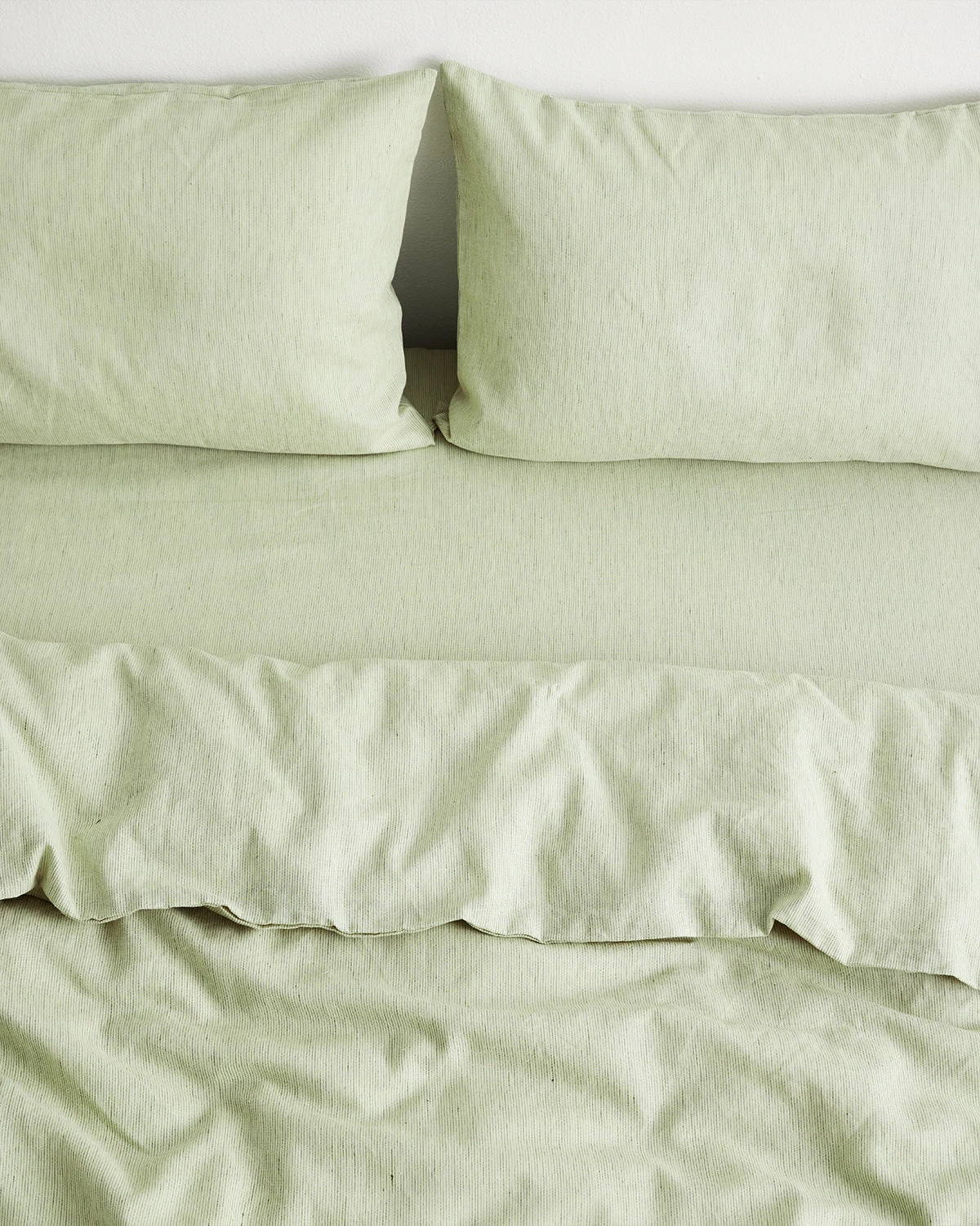 Buttery soft, pre-washed, and designed to last, our pure 100% French Flax Linen Bedding Set in Sage & Olive Stripe makes the whole bed feel like the cool side of the pillow with two pillowcases, a duvet cover, and a fitted sheet. A fresh take on our favorite green hues, Sage & Olive Stripe combines a soothing Sage base with a thin, vertical Olive stripe. This go-with-anything green is made all the more special by the fine stripe detail that reveals itself only to those who get up close (or under the covers).